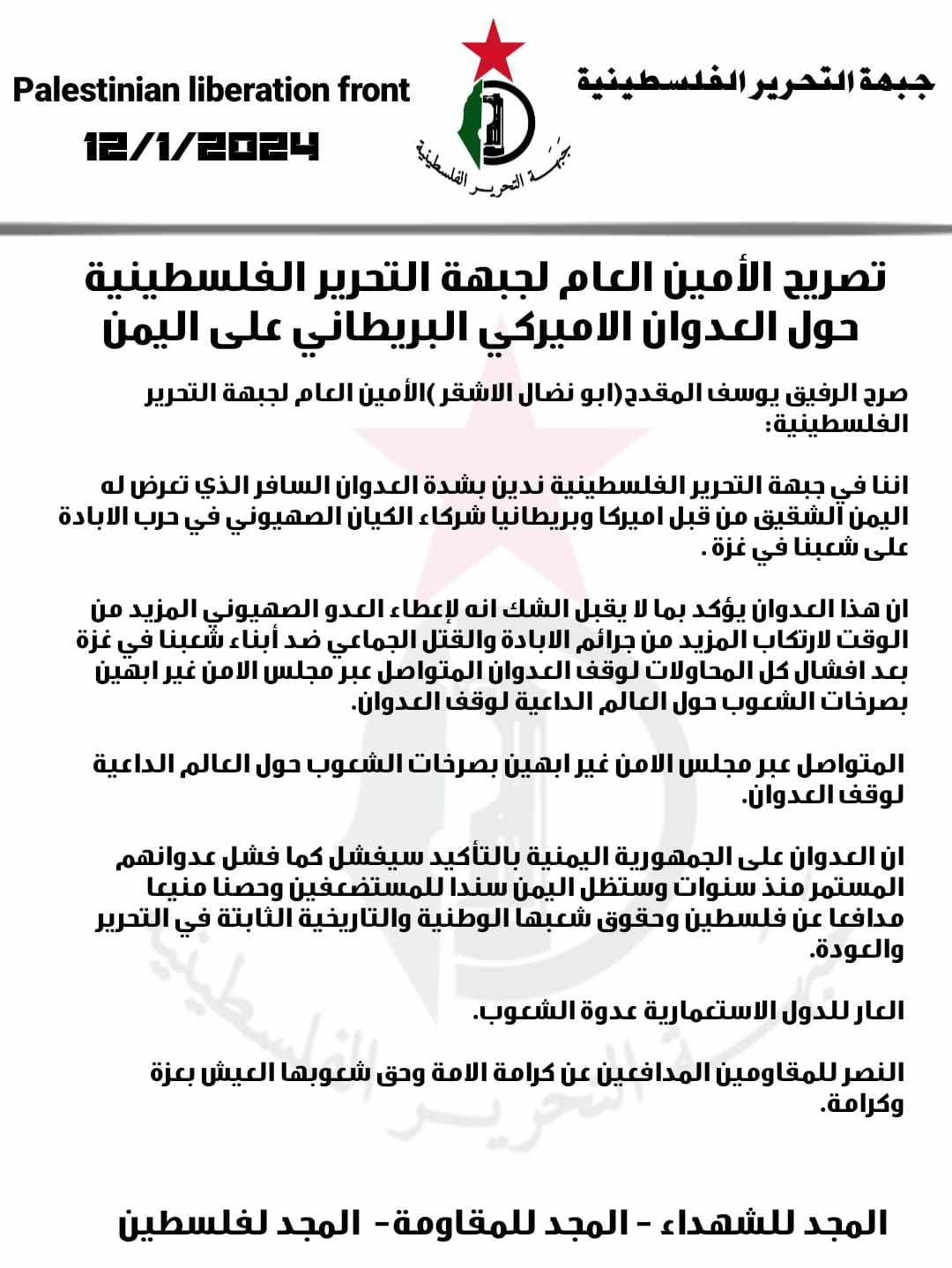 اننا في جبهة التحرير الفلسطينية ندين بشدة العدوان السافر الذي تعرض له اليمن الشقيق من قبل اميركا وبريطانيا شركاء الكيان الصهيوني في حرب الابادة على شعبنا في غزة